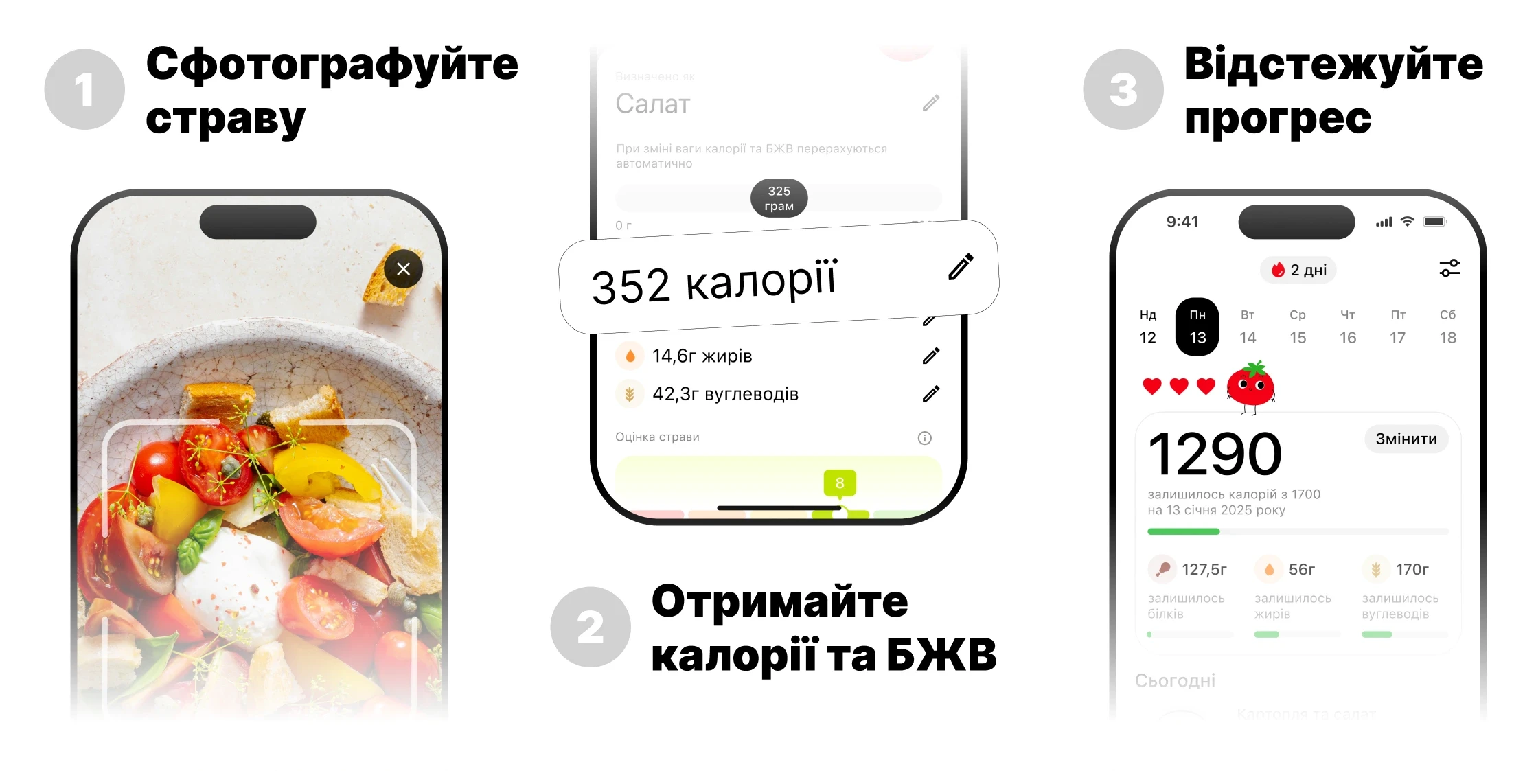 TrackAI uses advanced AI to analyze your meal and identify what’s on the plate. It recognizes hundreds of ingredients, mixed dishes, restaurant meals, and home-cooked foods - including Ukrainian dishes. The app detects components and generates an ingredient list in seconds.